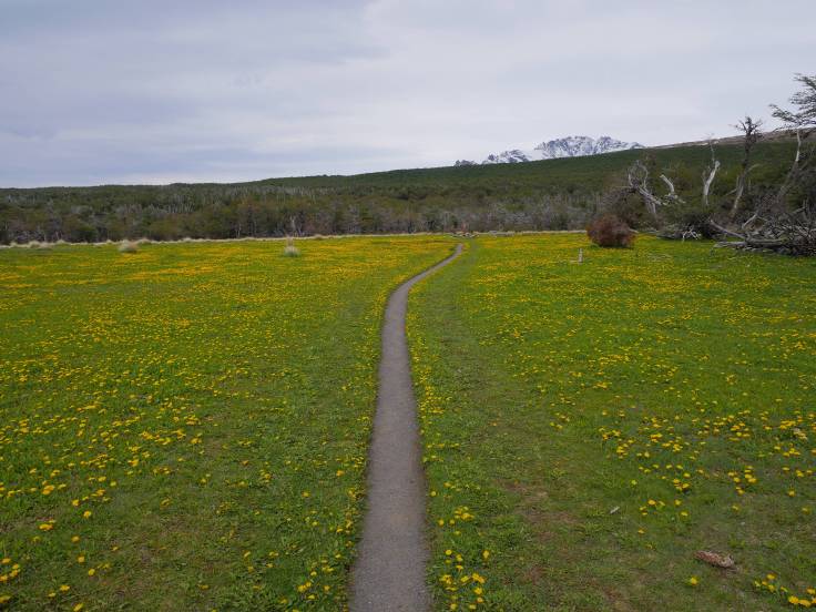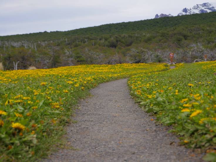 Cette randonnée, de 18km aller-retour, se décompose en quatre parties distincts. On commence dans un premier temps par une longue ascension dans les plaines, avec des champs de fleurs jaunes et les montagnes en arrière plan.