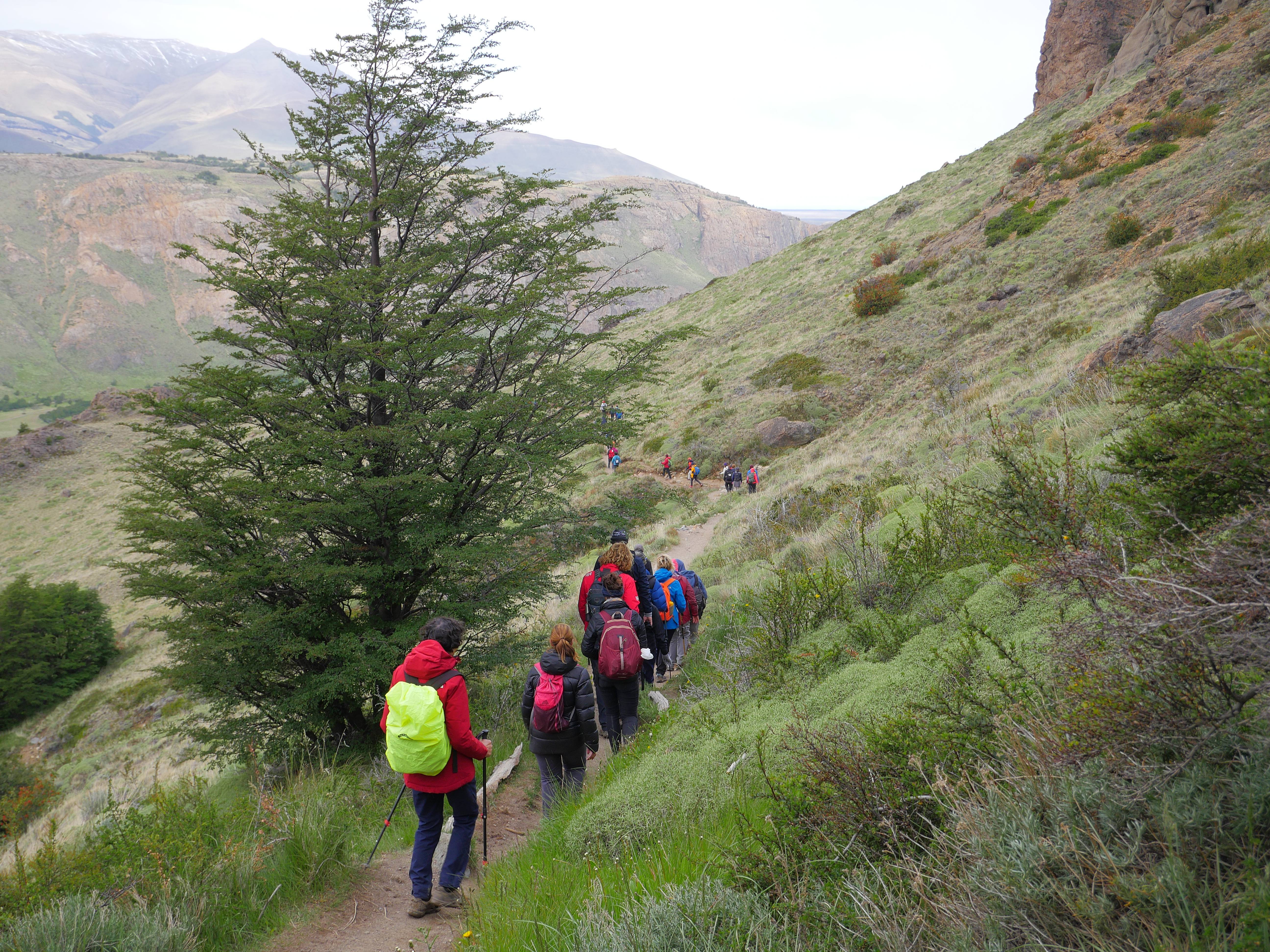 Première impression : il y a du monde ! Enfin, non pardon, c’est BLINDÉ ! On ne pensait pas qu’il y aurait autant de gens et de groupes. Le début est une montée d’environ 3km, sans difficulté ou presque, dans la forêt, où on peut s’arrêter sur plusieurs points de vue qui donnent sur la vallée. Malgré le ciel dégagé, le Fitz Roy est légèrement sous les nuages.