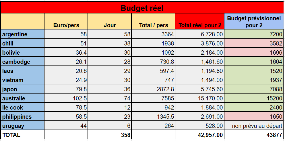 Si établir un itinéraire pour un tour du monde est difficile, alors estimer un budget est des plus compliqué ! Faire une estimation grossière de chaque pays, mais qui soit tout de même le plus proche de la réalité pour ne pas avoir trop de surprise n’est pas facile. Certaines excursions ou activités dans les pays sont chères voire très chères. Faire le choix de les faire ou non aura un impact non négligeable sur le budget général. Bonne nouvelle, grâce à nos estimations, et à la planification de notre itinéraire, d’un point de vue global, on a respecté notre budget ! On s’était attribué un montant par pays qu’il fallait que l’on respecte pour ne pas être dans le rouge. Pour avoir une petite marge, on a rajouté 10% d’erreur. Par ailleurs, dans l’estimation de certaines dépenses récurrentes (hôtels, restaurants, transports), on a fait parfois un peu plus large car les prix que l’on trouvait n’étaient pas forcément correctes. On a donc respecté notre budget pour l’ensemble des pays à l’exception de la Bolivie, du Chili et des Philippines. On avait prévu 43900 € pour 10 pays et au final on aura dépensé 43000€ pour 11 pays ! Ces chiffres ne tiennent pas compte des billets d’avions à 3324 € / personne. Au final, cela fait un sacré budget mais on ne regrette pas du tout cet investissement que l’on gardera en mémoire pour l’éternité !!
